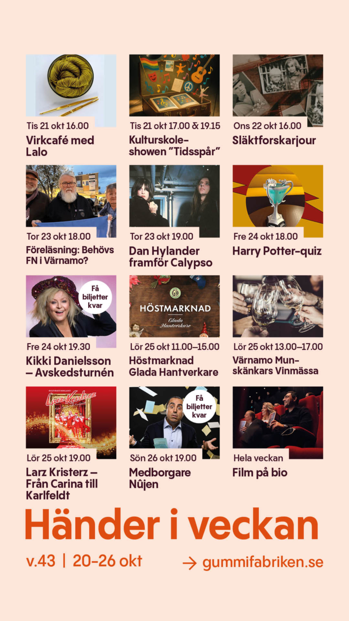 Genom att prenumerera på vårt nyhetsbrev är du först med att få information om biljettsläpp, kampanjer och erbjudanden till de evenemang som kommer till Gummifabriken.