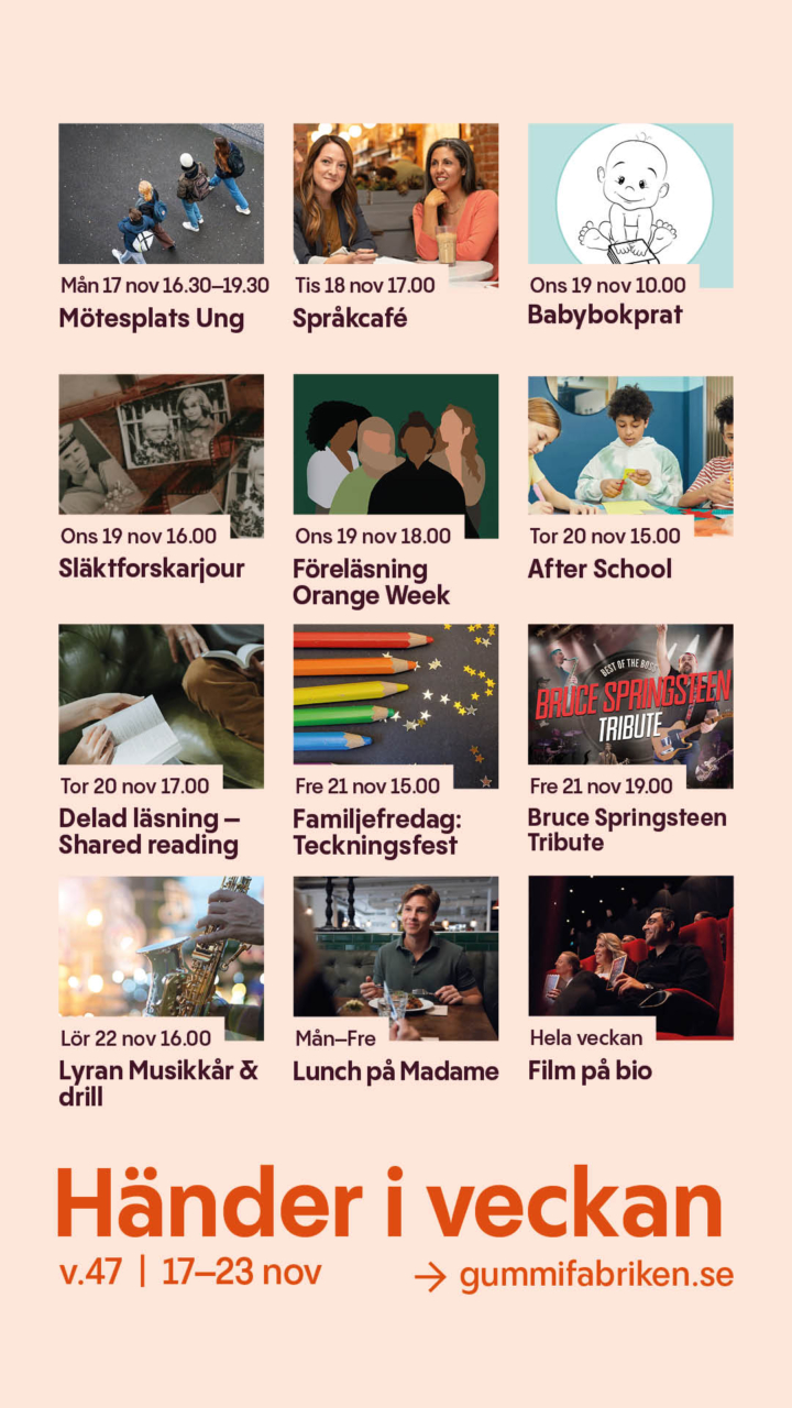 Välkommen till en ny vecka på Gummifabriken – där kultur, gemenskap och kreativa upplevelser fyller huset!