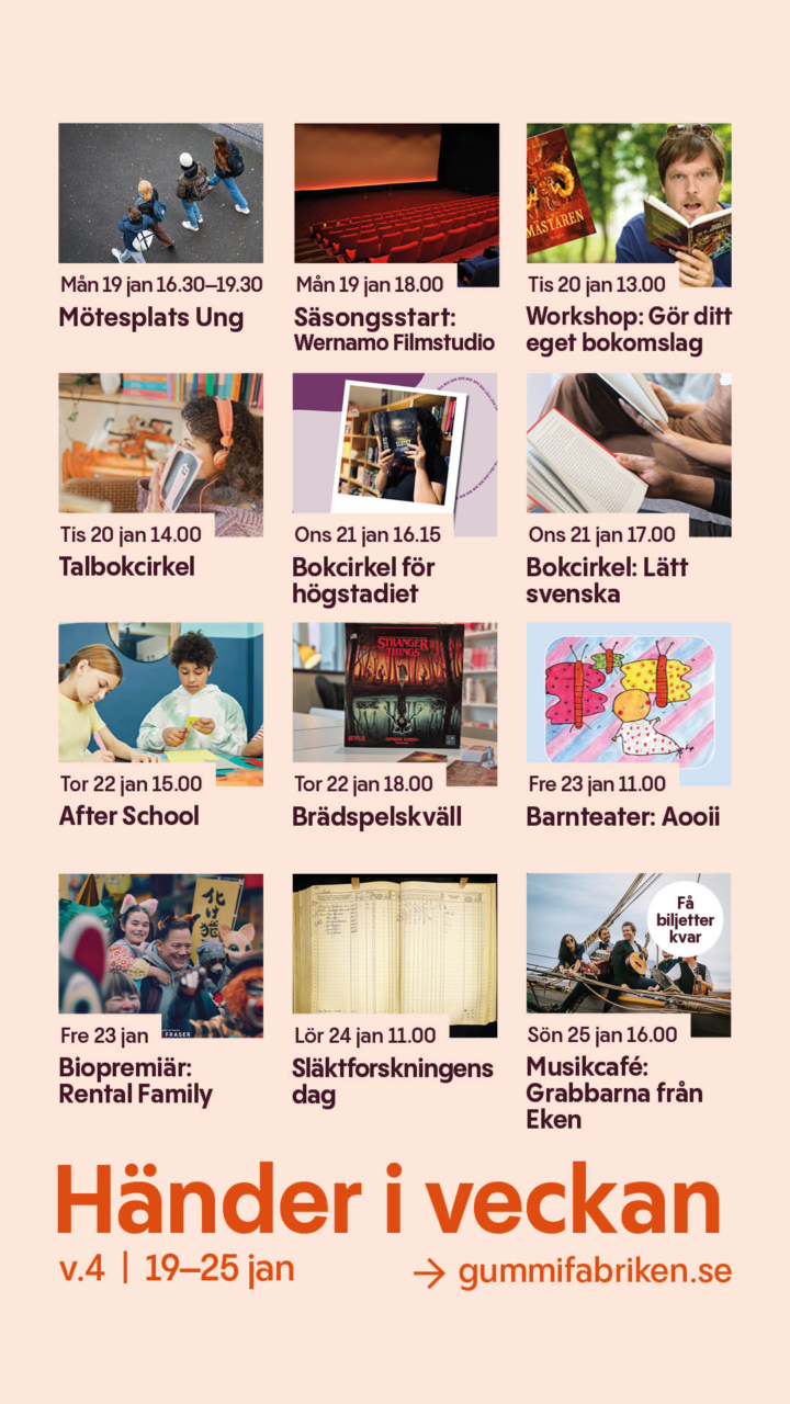 Varmt välkomna till den fjärde veckan på året. I huset så sker en massa spännande saker, allt ifrån bokcirklar, biopremiärer och musikcafé. Vi bjuder också in till årets första “Fika på Workspace” uppe på Plan 3 vid 14.30 under tisdagen. Hoppas ni alla får en fin vecka och ta hand om varandra!