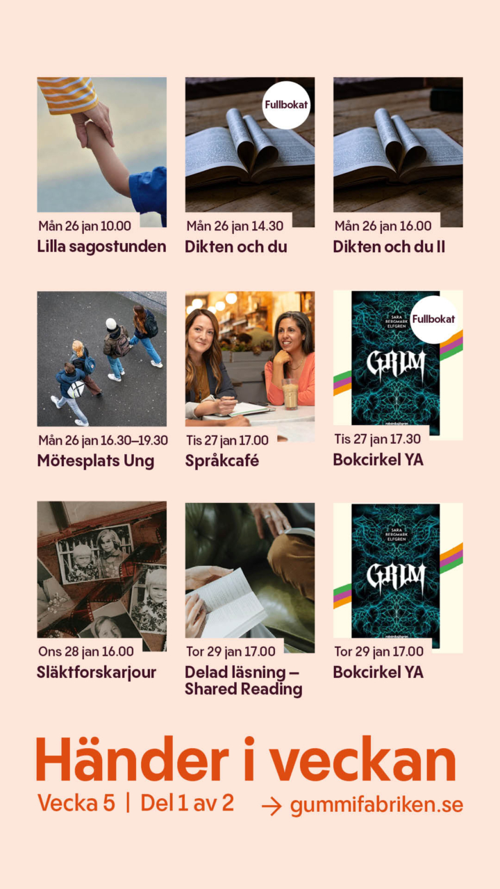 Denna vecka så erbjuds det en blandad kompott i huset när det kommer till evenemang. Man får möjlighet att delta på språkcafé, bokcirklar men även skratta (och kanske gråta) till och med Måns Möller och mycket mer. På onsdag så har vi Frukostmöte för alla hyresgäster där vi alla får ta del av information från verksamheterna i huset kring vad våren har att erbjuda. Hoppas vi ses!